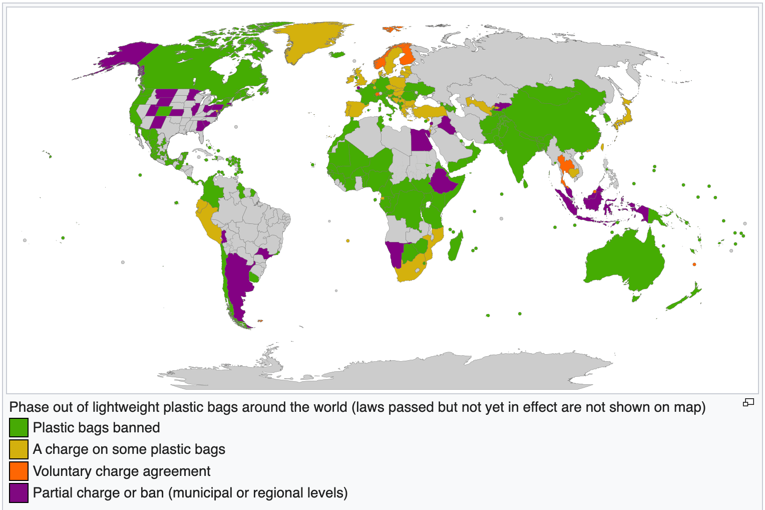 Overview of phase out of lightweight plastic bags (Wikipedia):